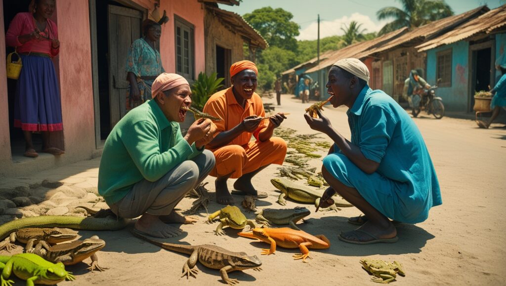 He narrates their ordeal and how children are hunting frogs and lizards as meals for survival.