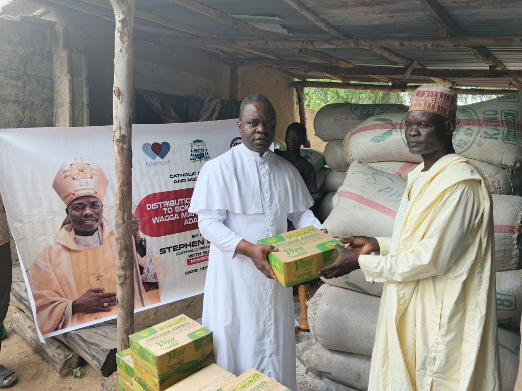 The Justice, Development and Peace Commission (JDPC) of the Catholic Diocese of Yola, in partnership with Mission Take Heart, has donated food items and other relief materials to residents of Wagga community in Madagali Local Government Area of Adamawa State following the recent insurgent attack in the area.